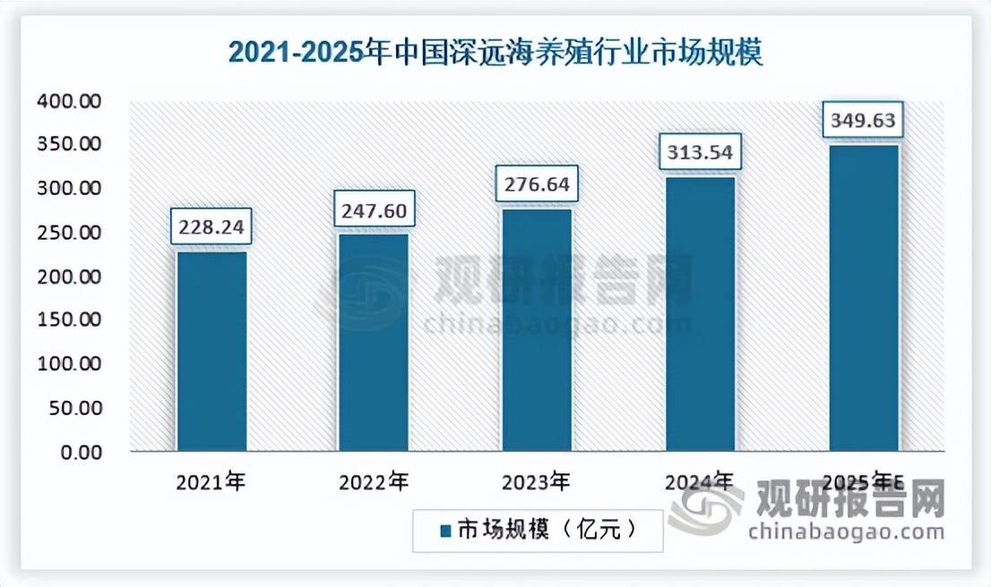 海水养殖是人类主动利用海洋资源的重要途径,深远海养殖的出现提升了海域资源的利用效率。在国家顶层设计的政策引导与资金支持下,深远海养殖正在由快速增长阶段转向高质量发展阶段,“国信一号”“深蓝一号”等大型深远海智能养殖装备已投入到养殖应用,并在产业链补助、金融保险以及海域使用保障等方面给予支持。我国深远海养殖尚处于高质量发展初期阶段,预计2025年中国深远海养殖行业市场规模约为349.63亿元,具体如下:
