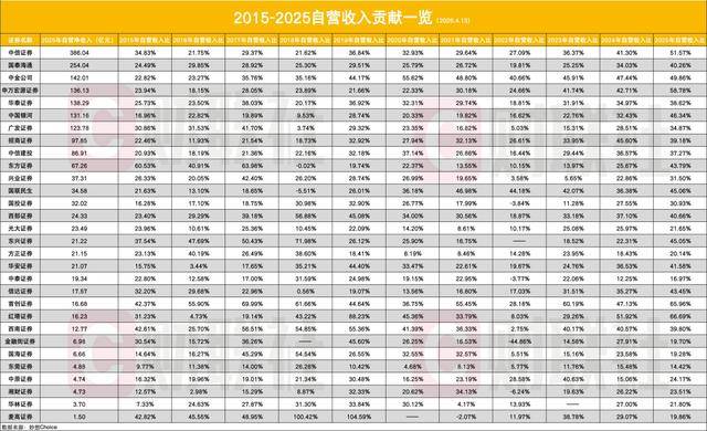 头部券商的自营权重尤为突出,中信证券从2015年的34.83%攀升至2025年的51.57%,提升16.74个百分点,同时也意味着当前其超过一半的收入来自自营投资;申万宏源证券在2025年的占比甚至高达58.78%。