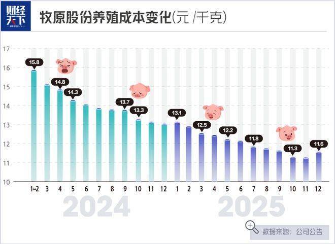 2025年1月,牧原股份生猪养殖成本为13.1元/千克;5月降至12.2元/千克;到了10月及11月已降至11.3元/千克;12月略有上升,为11.6元/千克。2025年全年,牧原股份平均养殖成本约12元/千克。